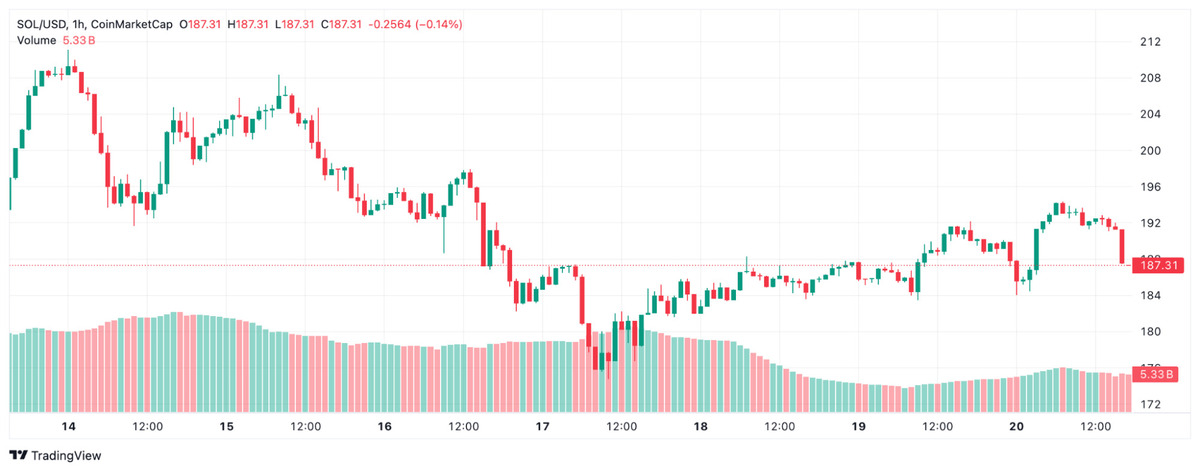 The recent uptick in large-cap altcoins looks more like hesitation than renewed strength. Solana is holding around $188, barely up 0.5% on the day, yet trading volume continues to fade.
