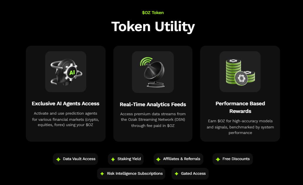 Ozak AI stands out because of its decentralized infrastructure design. The platform uses a DePIN (Decentralized Physical Infrastructure Network), which means that processing power is dispersed rather than controlled by a single entity. Also, it offers custom prediction Agents (PAs), where users can customize it according to their trading, with that PAs results, they can earn $OZ as rewards