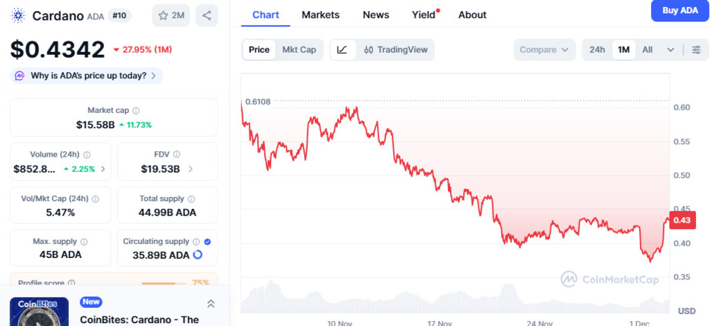 The Cardano price is currently at $0.4, in a downtrend on higher timeframes. Despite the slight gain this week, a 27% downturn is visible on its 30-day chart. Additionally, it has decreased by 48% over the past 90 days.