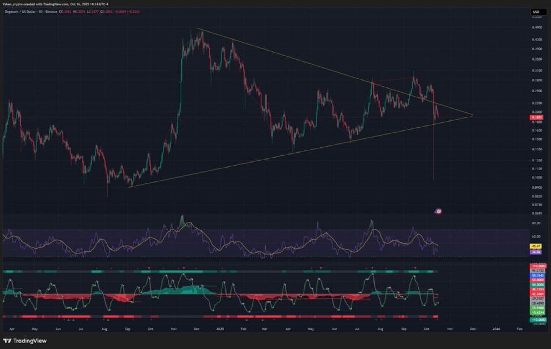 Still, analysts like Tardigrade and Shan Specter reaffirm DOGE’s bullish setup, highlighting its position within a “bullish triangle,” a pattern that often signals strong breakouts. A move above $0.20 could spark renewed buying, pushing DOGE past $0.22–$0.24 toward $0.25 and $0.33 — paving the way for a potential run to $1.