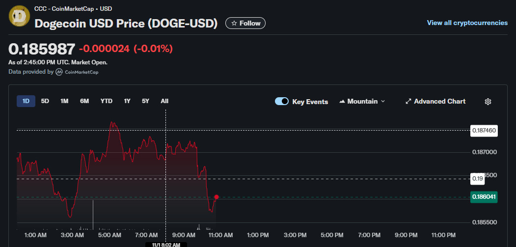 As of November 2025, Dogecoin trades near $0.1882, holding a bearish sentiment with 87% of technical indicators flashing red and a Fear & Greed Index score of 33 (Fear).