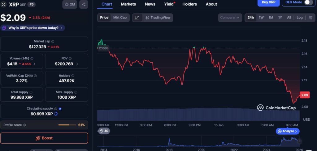 XRP has shown renewed strength following a recovery from the $2.00 support area, trading near $2.14 as of January 14, 2026. Institutional interest has increased alongside reported ETF inflows exceeding $1 billion over recent weeks, contributing to a tightening supply environment on exchanges.