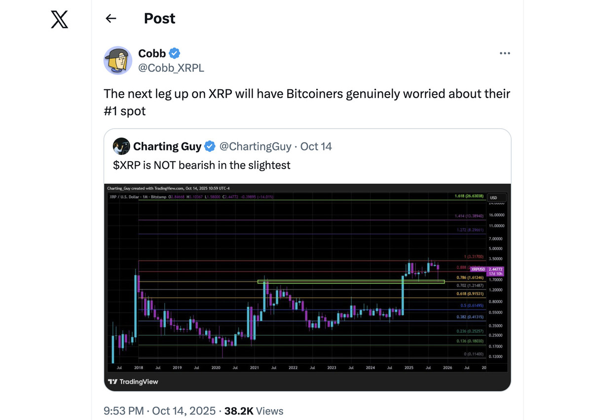 Market watcher Charting Guy shared a monthly chart showing XRP consolidating near the 0.888 Fibonacci retracement level at $2.44. He pointed out that XRP remains “not bearish in the slightest,” suggesting a healthy setup before a possible move above $3.31.