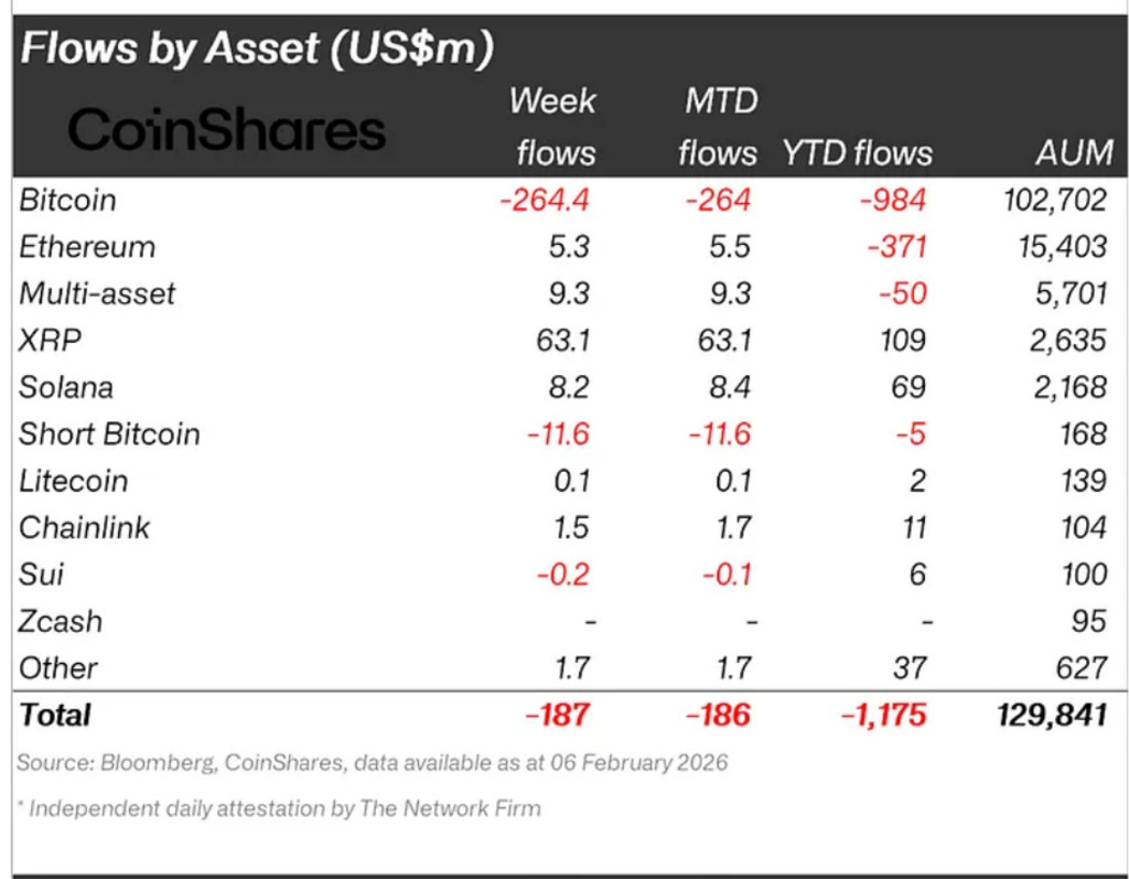 While retail participants remain hesitant during the current market correction, larger financial players are continuing to allocate capital to XRP. Data from the latest CoinShares Digital Asset Fund Flows report shows that, for the week ending February 6, 2026, XRP-linked products attracted $63.1 million in new inflows.