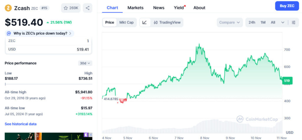 The Zcash price crossed $730 this week. However, profit-taking pushed it toward $500. But its run is far from over. Additionally, the altcoin remains on the upside—a 20% gain in the last seven days.