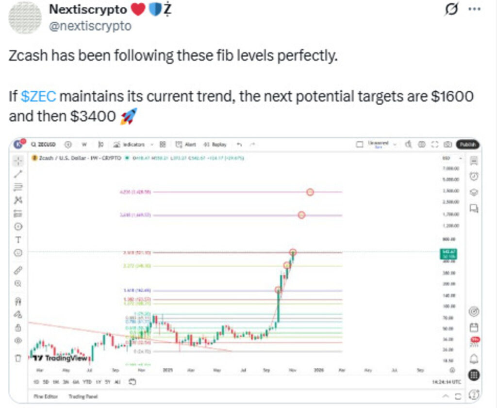 Hailed as one of the most promising altcoins to buy in November as demand for privacy surges, the Zcash price may hit $1,000 next. For crypto analyst Nextiscrypto, the next targets are $1,600, followed by $3,400, making it a great pick this year.