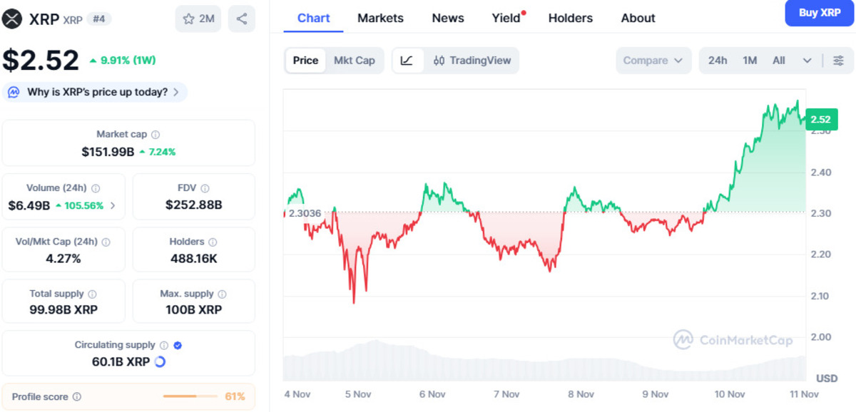 After retesting $2.0 this week, the XRP price is back on the upside. A 10% gain pushed the altcoin price above $2.5, with $2.69, its 30-day high, as the next target. The US Senate deal to end the government shutdown lifts risk appetite, driving an upswing. But that isn’t all.