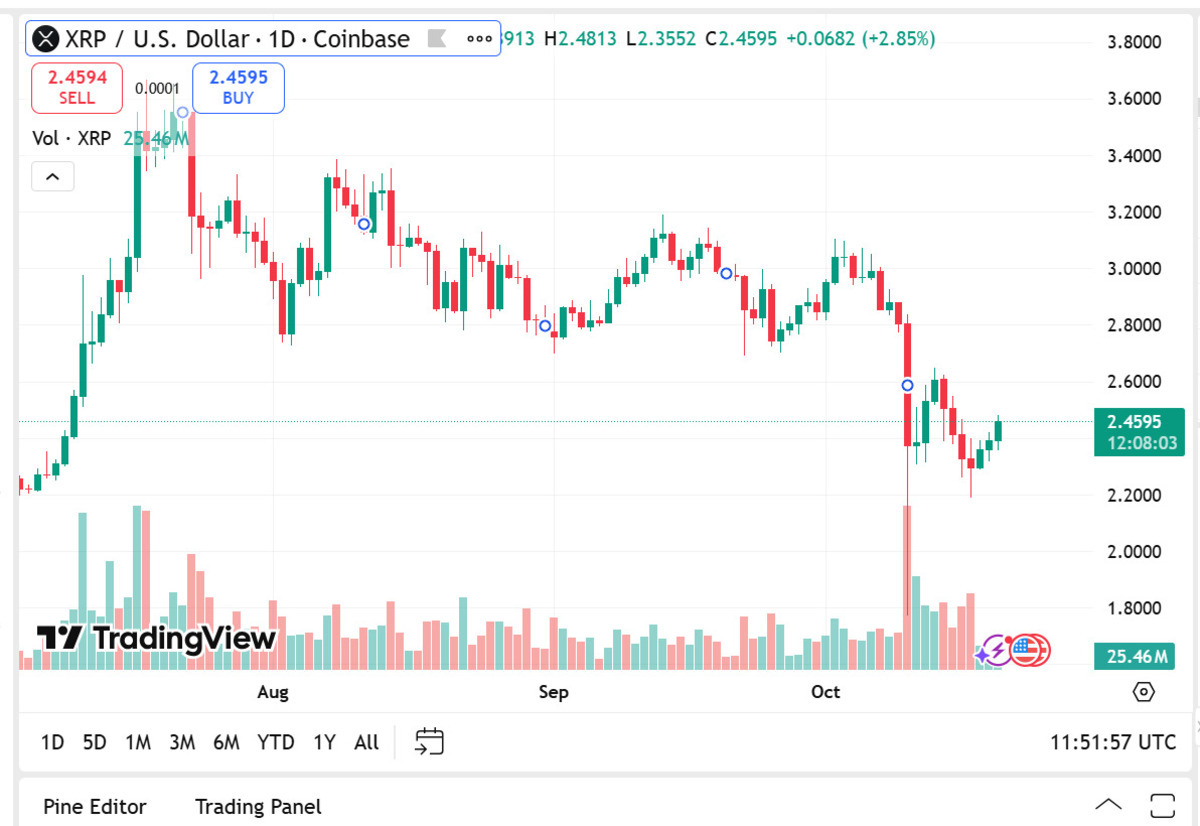 XRP is now at $2.45, up by 3.51% in the last 24 hours. Its market capitalization stands at $147.54 billion, with trading volume of $3.8 billion ā up by 28.13%. These figures translate to increased trading, which is most likely on the part of big holders due to accumulation.Ā