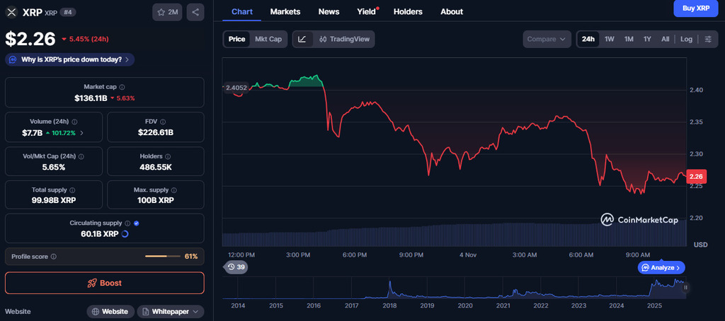 XRP’s technical setup paints a picture of quiet tension. The token trades near $2.26, with a bearish sentiment of 83% and a Fear & Greed Index at 21 (Extreme Fear), a combination that often signals a cautious market rather than outright panic.
