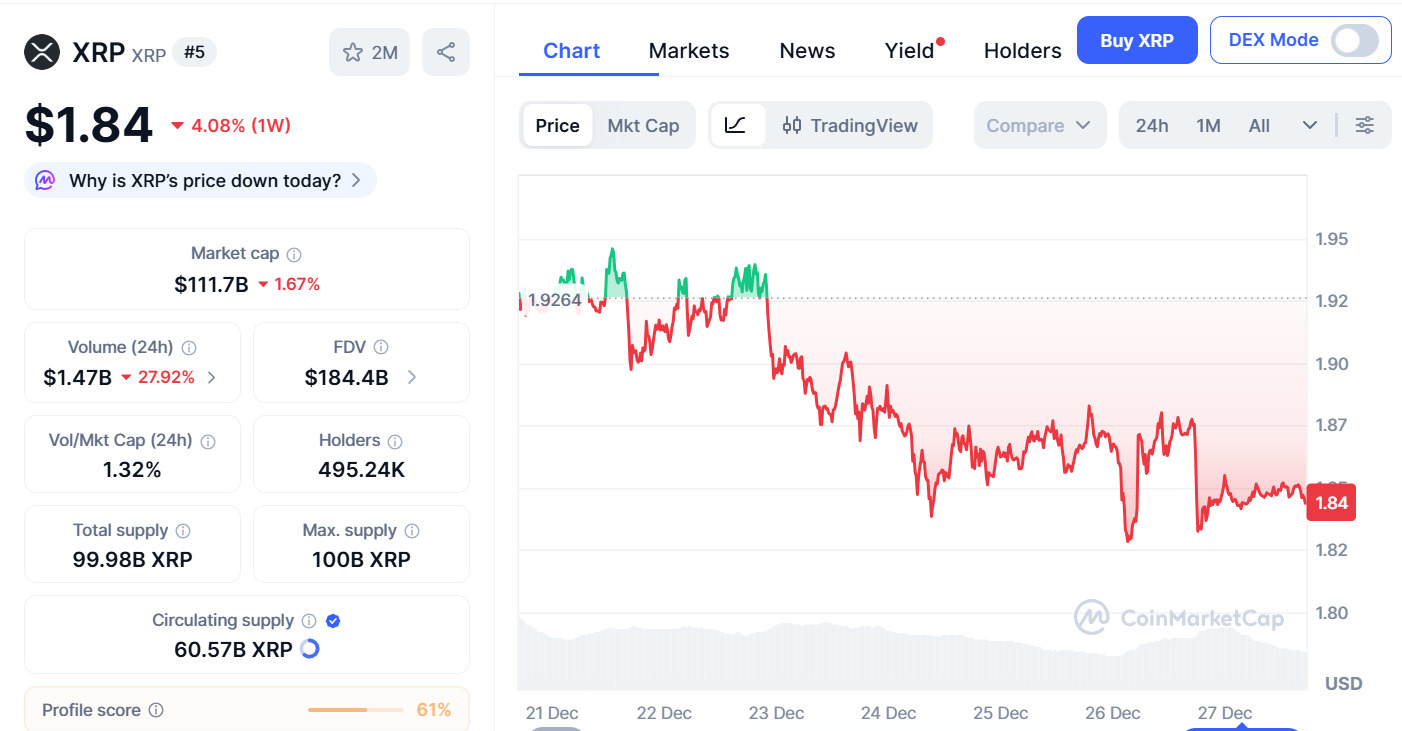 Price action saw XRP fall to approximately $1.82 on December 26 before a modest rebound. By December 27, it stabilized around $1.84. Compared with its July peak near $3.65, XRP has experienced a significant retracement, reflecting the broader challenges facing large-cap cryptocurrencies in the current market environment.