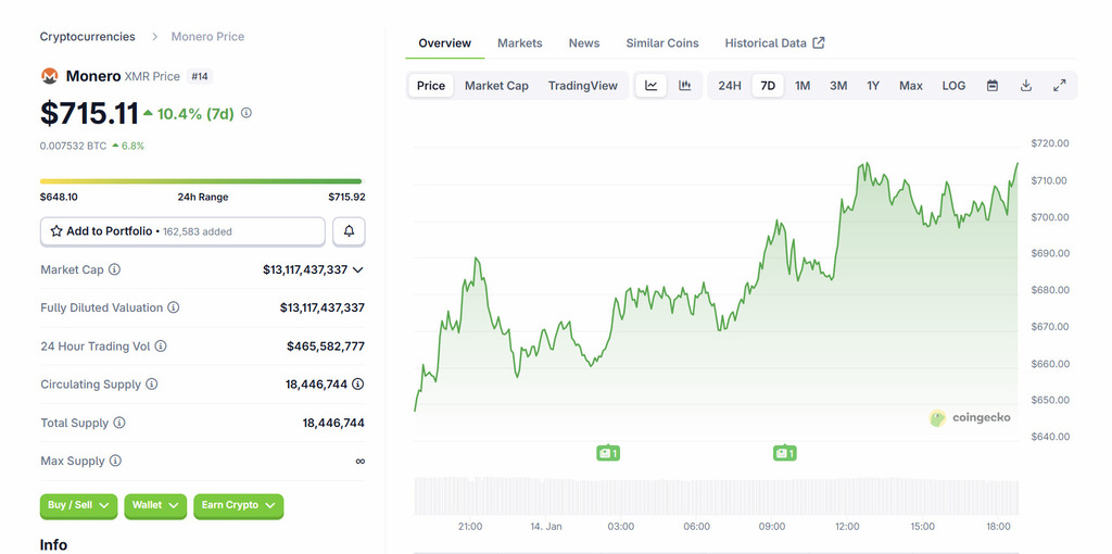 Recent Monero (XMR) price updates indicate continued momentum into January 2026. The token has been trading between $698 and $715 after moving above the $600 level earlier in the month. Moneroās market capitalization is now close to $13 billion, supported by daily trading volumes near $450 million and a circulating supply of approximately 18.4 million XMR.